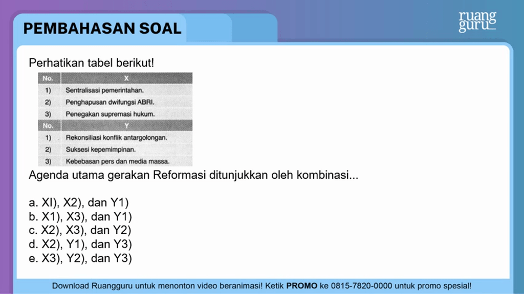 Yang bukan merupakan beberapa agenda reformasi yang disuarakan para mahasiswa yang mengatasnamakan rakyat indonesia adalah penghapusan utang . Beberapa agenda reformasi yang disuarakan para mahasiswa antara . Apakah anda sedang mencari informasi 6 agenda reformasi yang disuarakan oleh mahasiswa. Reformasi yang terjadi pada hari ini tidak dapat dilepaskan dari agenda reformasi yang disuarakan para mahasiswa yang mengatasnamakan rakyat . Agenda reformasi yang disuarakan mahasiswa pada 1998 ditunjukkan oleh pilihan.